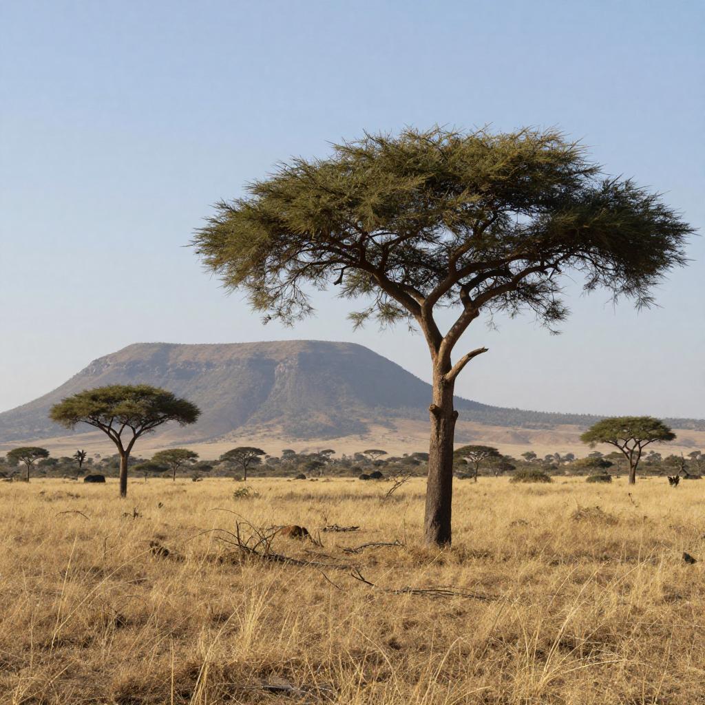 Photograph of a sunlit savanna landscape. In the foreground, a single, tall acacia tree with a wide, flat canopy stands to the right. The midground features dry, golden grass stretching across the scene. In the background, a distant, gently sloping mountain with a rounded peak rises against a clear blue sky. The scene feels serene and expansive.