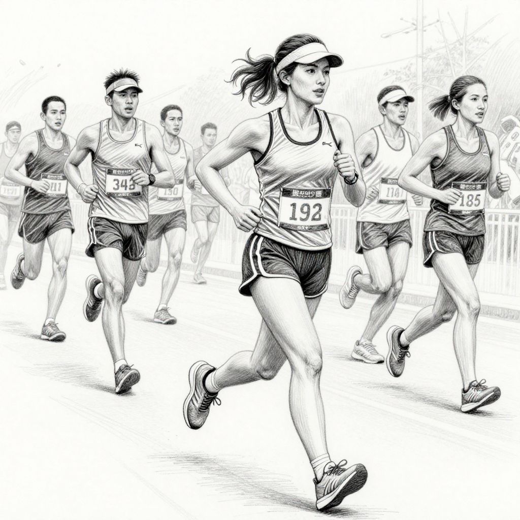 A black and white pencil sketch depicts a woman running in a marathon, surrounded by other runners, with intricate details and thin lines.