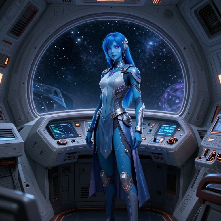Imagine full body shot of astra with blue skin, blue hair and purple eyes seen in breathtaking photorealism, standing at the helm of a massive spaceship, She wears a flowing, high-tech uniform with glowing details, her purple eyes reflecting the stars beyond the ship’s window, The scene is rich in detail, from the subtle glow of her skin to the intricate controls of the spacecraft, conveying her mastery of the stars
