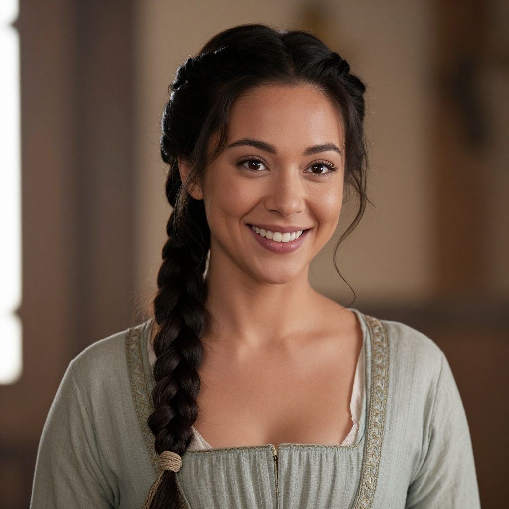 Woman in period attire smiles warmly, her hair styled in intricate braids, set against a softly lit interior backdrop.