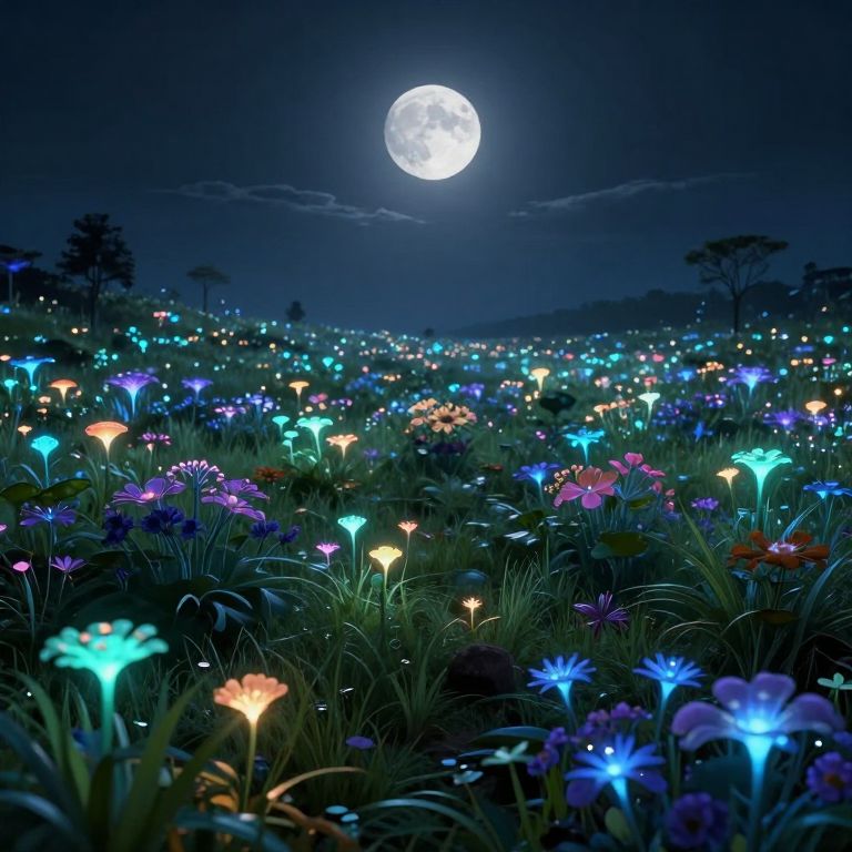 Photograph of a night scene featuring a glowing, moonlit field filled with bioluminescent flowers in vibrant colors, including blue, purple, orange, and pink. The full moon, partially obscured by a thin cloud, casts a bright, white light overhead. The flowers, with their luminous petals and green stems, create a magical, ethereal atmosphere. Silhouetted trees are visible in the background, adding depth to the scene. The dark blue sky contrasts with the bright, colorful flowers, enhancing their glow. The image has a dreamlike quality, evoking a sense of wonder and enchantment.