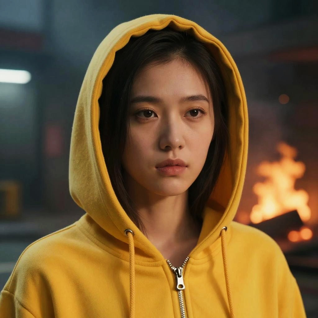 Closeup portrait of asian woman, wearing yellow hoodie, dystopian street background, (smoke), detailed, cinematic composition, intricate details, highly detailed, fire, at night
