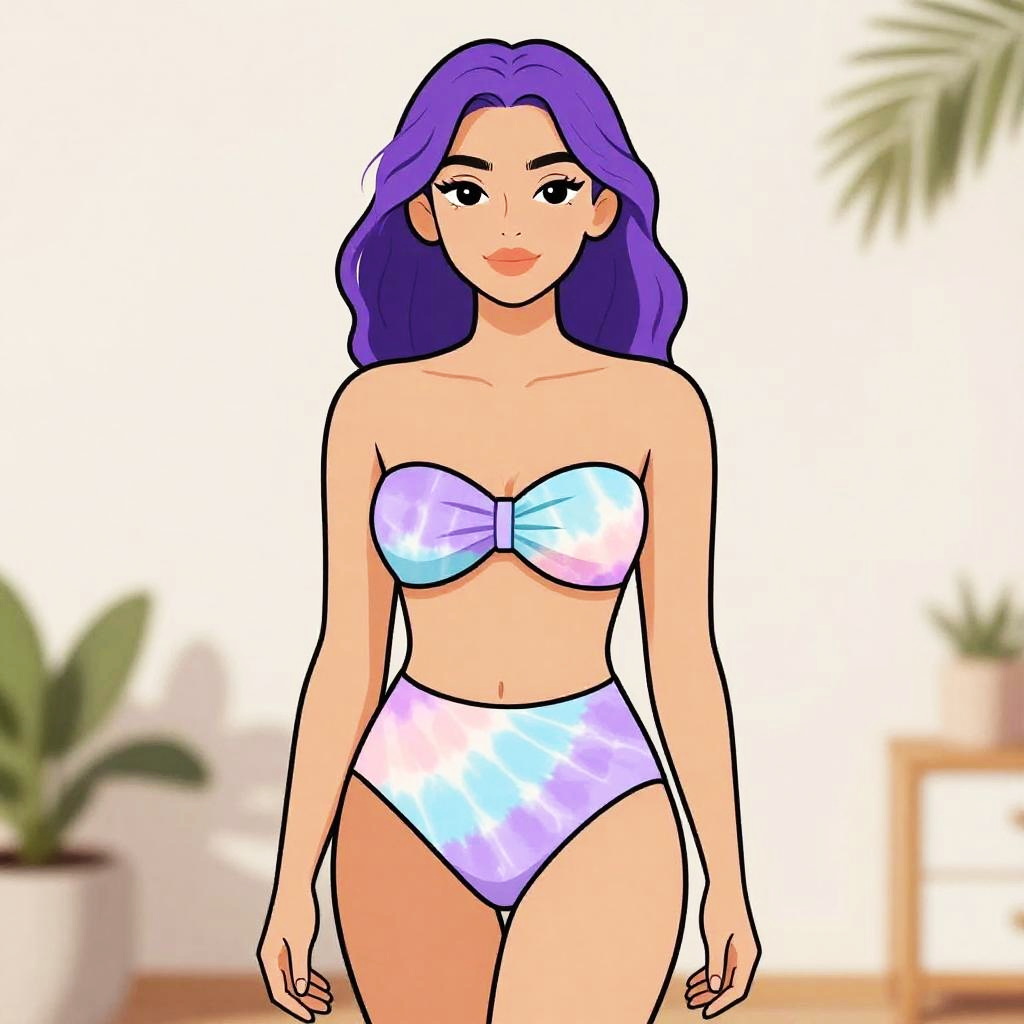 Woman with pretty face and pretty hair. Woman, contemporary swimwear, bandeau bikini top with a ruched center, high-waisted bikini bottoms, pastel tie-dye print in shades of blue, purple, and pink, minimalistic, plain indoor background with a hint of greenery. --sref 1467