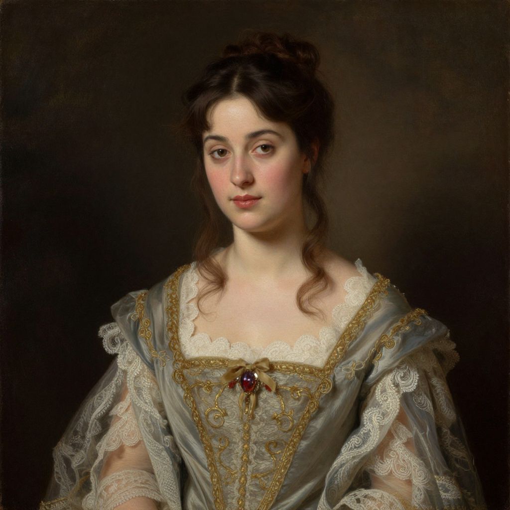 A classical portrait rendered in a hyper-realistic style reminiscent of traditional oil paintings, featuring a woman adorned in an elegant, vintage-inspired gown with intricate lace details and gold embellishments, set against a dark, textured background that enhances the subject's luminous presence.
