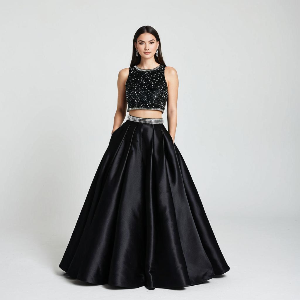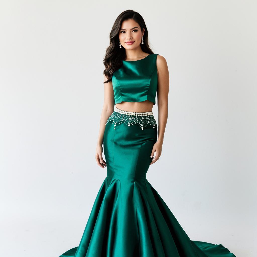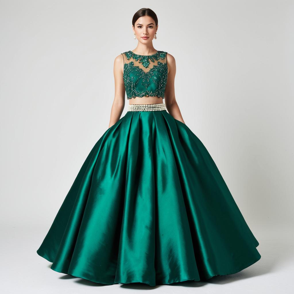 Woman, formal occasion, emerald green velvet gown, sleeveless cropped top with scalloped edge, delicate pearl embellishments, round neckline, high-waisted voluminous ball skirt, smooth satin fabric, floor-length, beaded waistband, white studio background