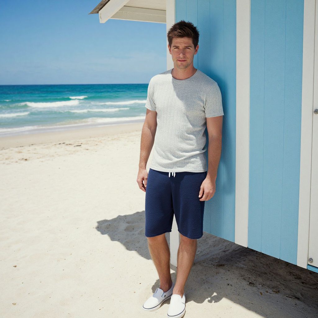 Photograph of a young Caucasian man with short brown hair, standing against a light blue wooden structure on a sunny beach. He wears a white, short-sleeved, heathered t-shirt and navy blue knee-length swim trunks with white drawstrings. He also has white sneakers with black accents. The beach has white sand and turquoise waves in the background. The man stands with a relaxed posture, slightly leaning against the wall, with bright sunlight casting shadows. The sky is clear and blue, enhancing the beach's vibrant colors.