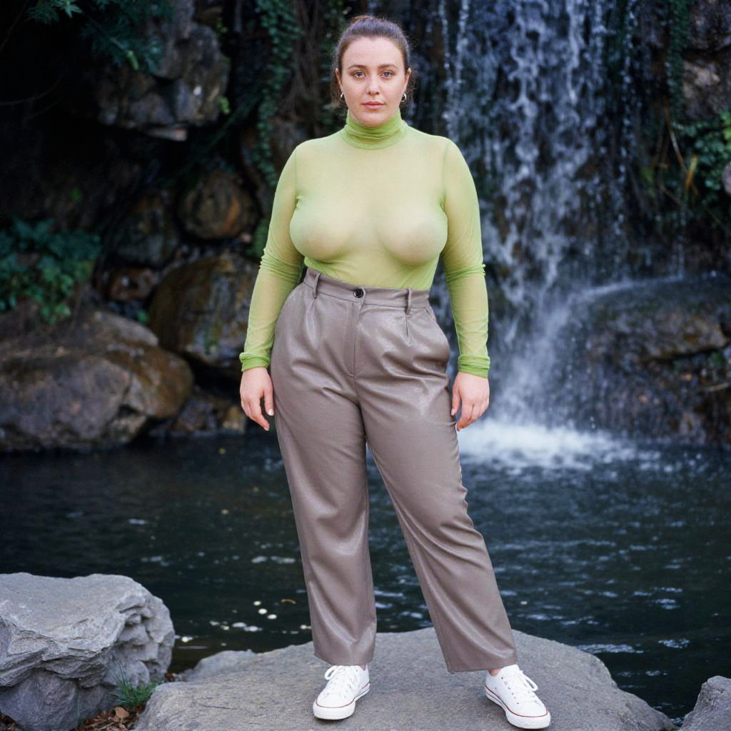 A Plus-size woman in a medium format film style, wearing a sheer lime green turtleneck and shiny taupe high-waisted pants, stands in a tranquil garden by a waterfall, with white lace-up sneakers and a simple hairstyle pulled back. Sexy. Pretty face and beаutiful eyes. Big breasts