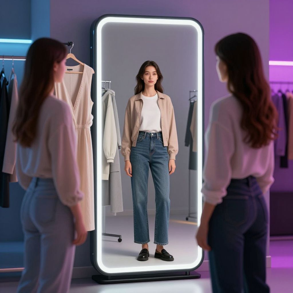 AI clothes changer online free scene, a young woman exploring virtual fashion styles on a transparent holographic screen, high detail digital art, neon accents, stylish casual and formal wear options, futuristic room setting with advanced AI tech