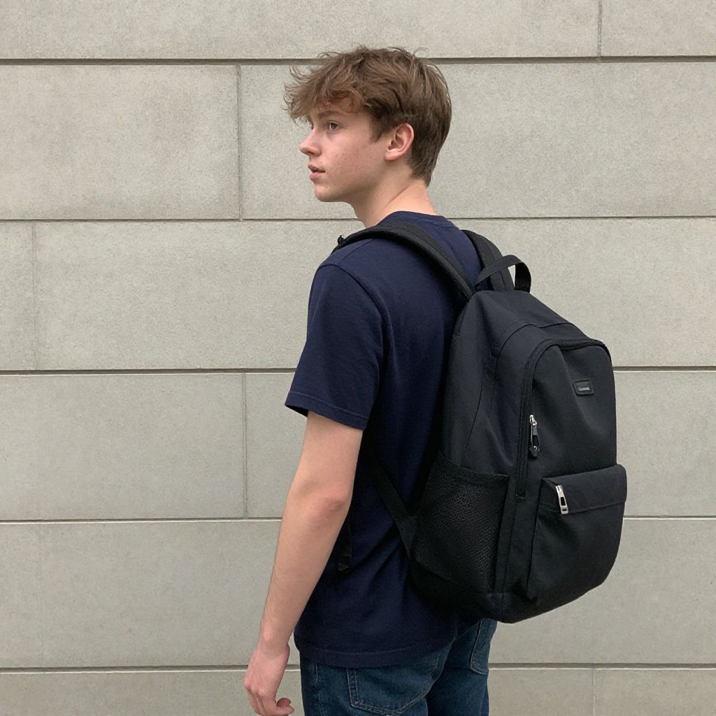 Photograph of a young Caucasian man with light brown, tousled hair, standing in profile against a gray, textured concrete wall. He wears a plain black T-shirt and dark blue jeans, with a black backpack featuring multiple pockets and straps. His expression is neutral, and he gazes to the right. The image is well-lit with natural light, highlighting the simplicity and casualness of his outfit and the modern, urban setting. The background is plain, focusing attention on the subject.