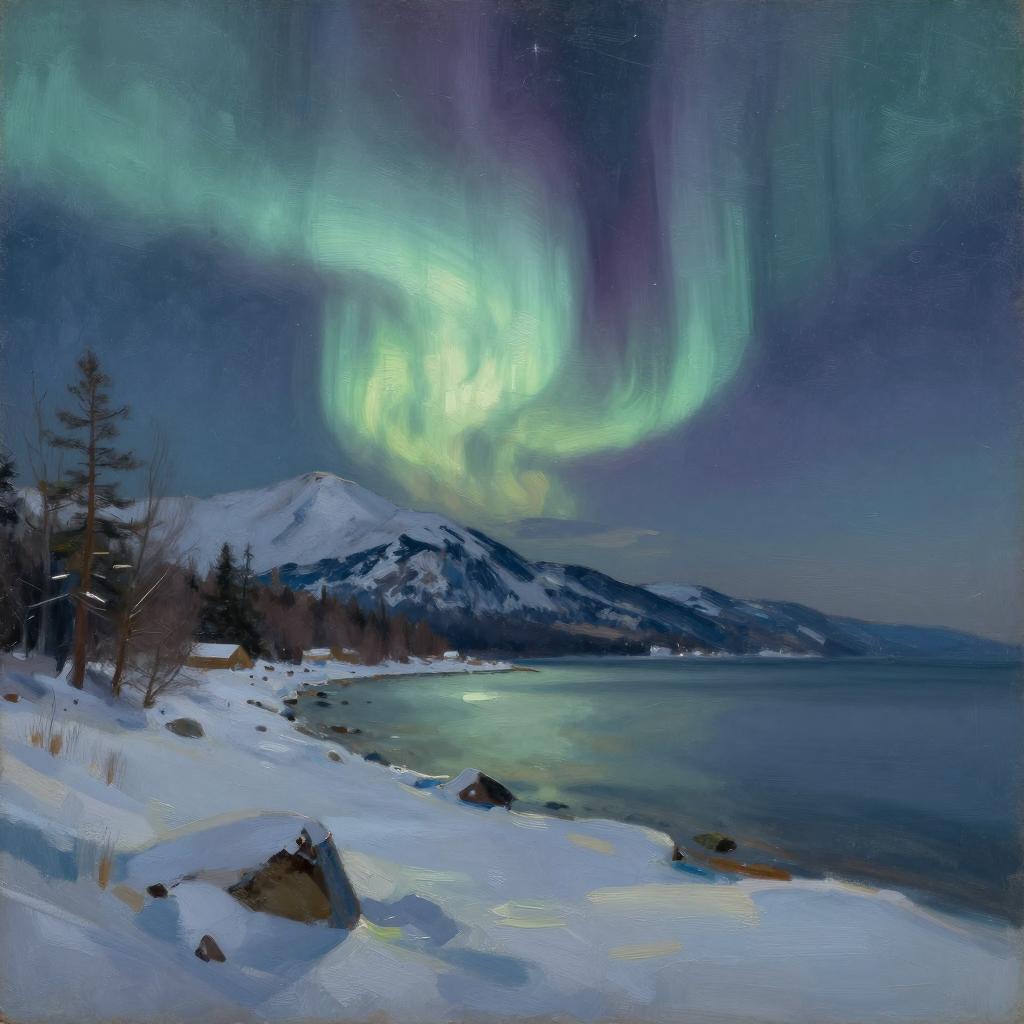 Sequence Canadian impressionism winter landscape painting with mountains and an ocean. long exposure at night with the northern lights in the sky. dramatic lighting, thick brush strokes, and muted colours. painting,