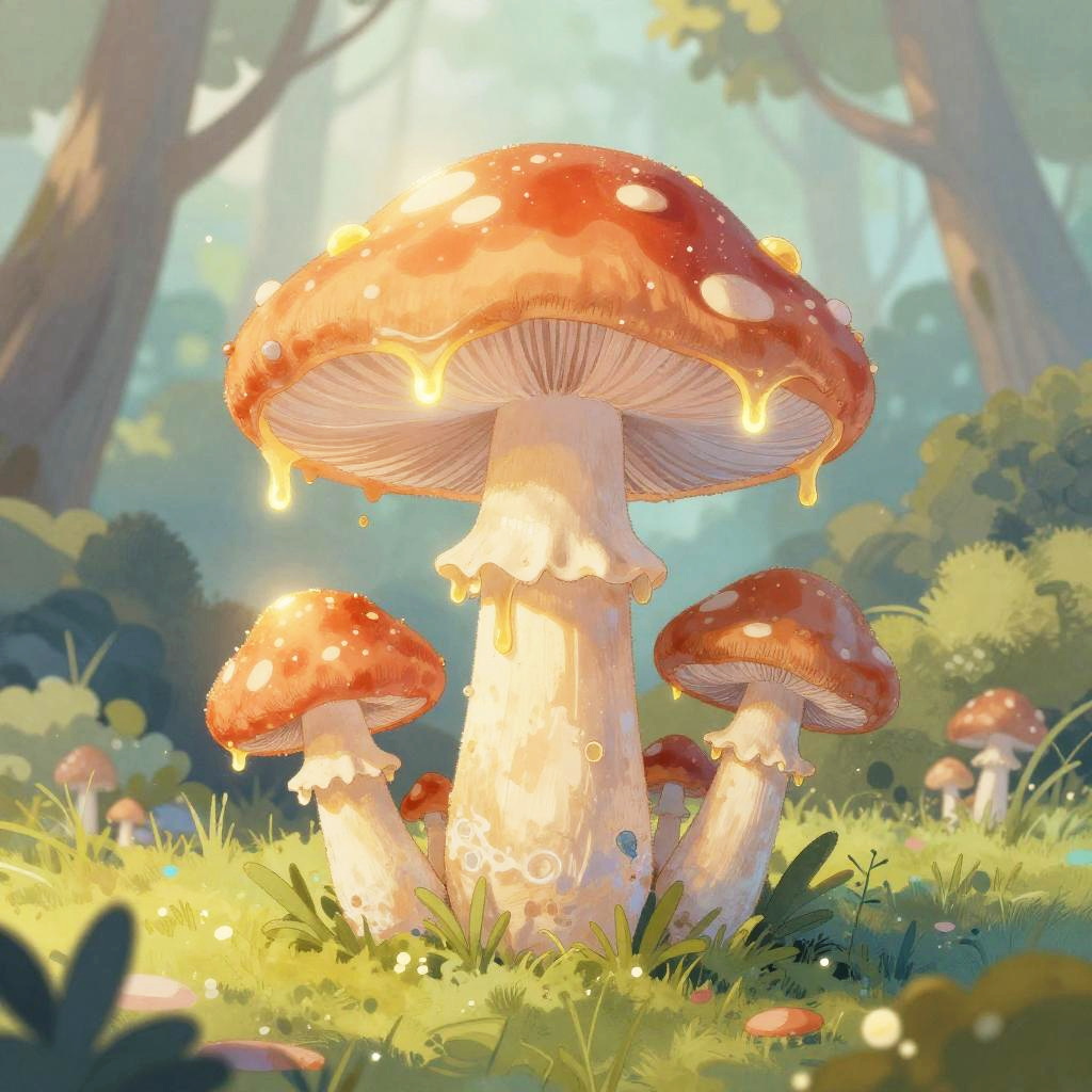 Dripping mushroom drawing, close-up of a giant toadstool with melting colorful caps, intricate line art, dark forest setting, fantasy illustration with glowing effects