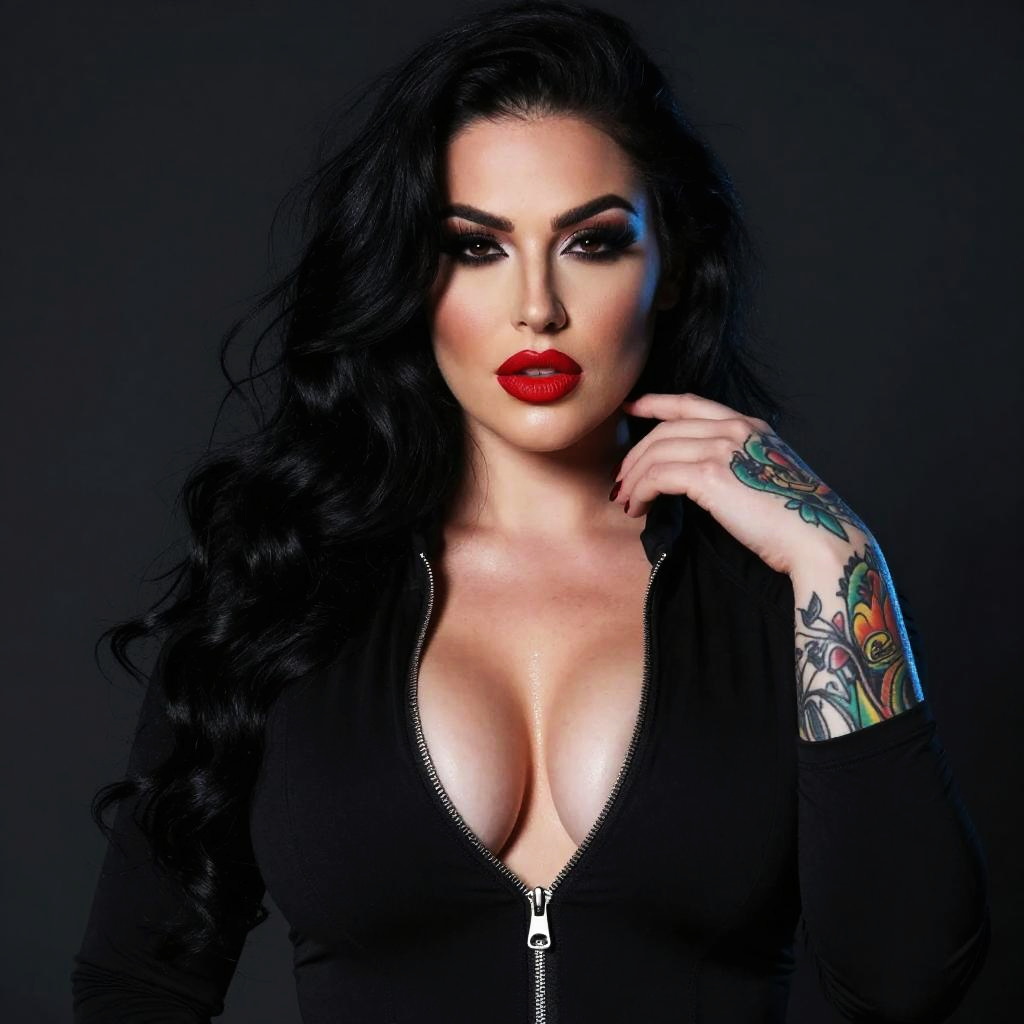 Photograph of a confident woman with long black hair, wearing a black leather crop top and high-waisted leather pants, black fingerless gloves,