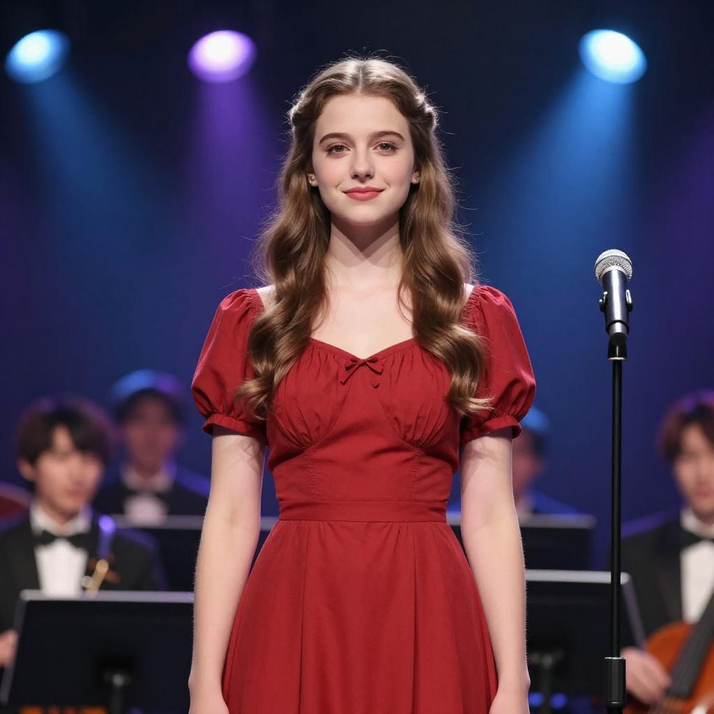 Photograph of a smiling young woman with long blonde hair, wearing a blue and orange varsity jacket, orange pants, and brown boots, dancing on stage with her hands raised. Two other women, one in a sparkly dress and the other in a sleeveless top, are kneeling in the background, smiling. The stage is dimly lit with a spotlight on the dancer.