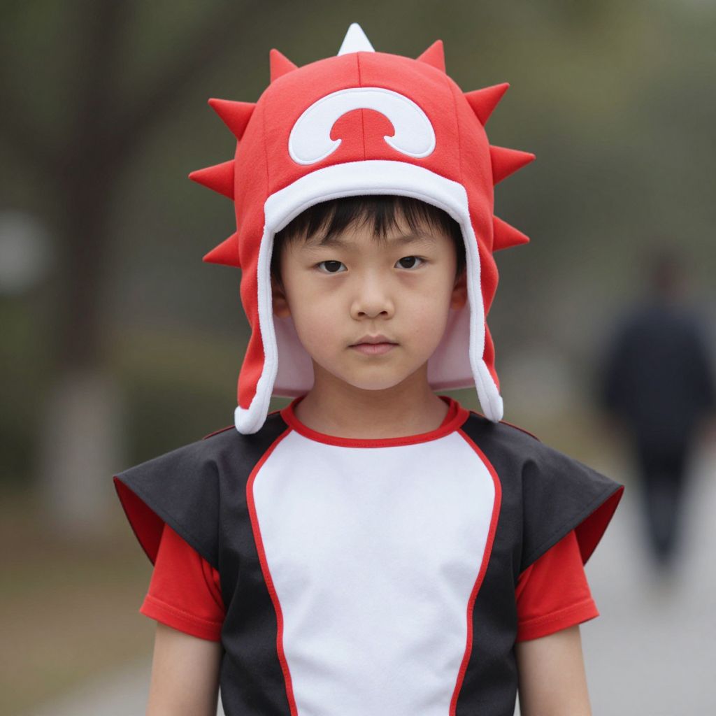 Photograph of a young Asian boy standing outdoors, wearing a red and white dragon costume with spiked edges and a white spiral symbol on the forehead. His costume has black sleeves with red trim and a white front. The boy has straight black hair, fair skin, and a neutral expression. The blurred background features a path and greenery, with a person in dark clothing in the distance. The image has a shallow depth of field, focusing on the boy while the background is out of focus.