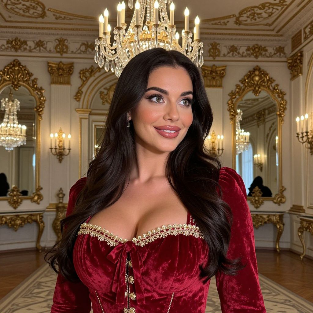Photograph of a beautiful woman with long, wavy black hair and fair skin, wearing a deep red velvet gown with gold trim and a low neckline, highlighting her large breasts. She has bright blue eyes, full lips with glossy pink lipstick, and is smiling slightly. She stands in an opulent, baroque-style room with ornate gold-framed mirrors, chandeliers, and wall sconces. The background features intricate white and gold moldings on the walls and a patterned floor. The lighting is warm, enhancing the luxurious atmosphere. The woman's confident and elegant appearance contrasts with the lavish, historic interior.