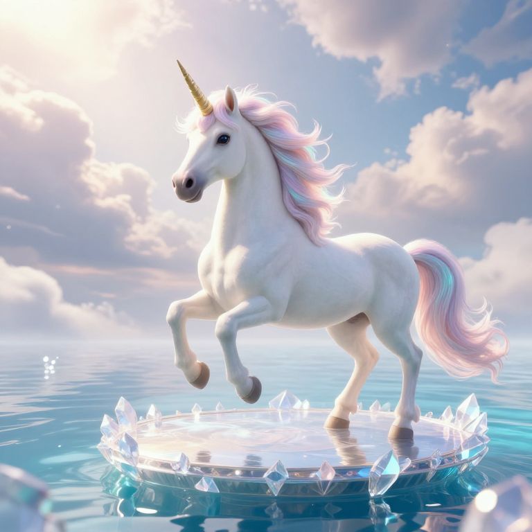Digital art of a glowing, white unicorn with a pastel rainbow mane and tail, standing on a cloud pedestal in a whimsical, pink and blue