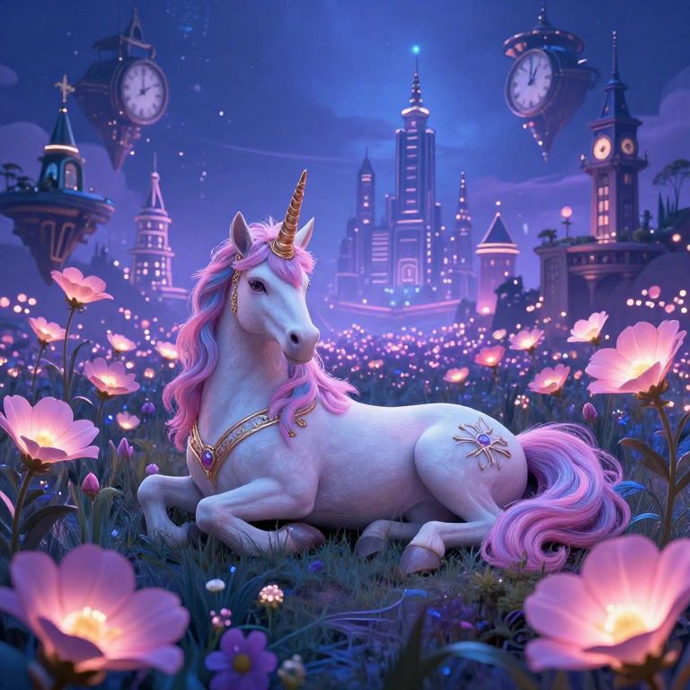 In this captivating digital artwork, an ethereal unicorn stands majestically atop a cloud-bound stage, its iridescent mane shimmering with a range of vivid colors as it gazes towards the distant horizon. The unique vantage point emphasizes the creature's graceful outline from above, highlighting its enchanting aura and evoking feelings of wonderment and mystique. Surrounding this magical being is an intricate dreamscape filled with surrealist structures and a soft pastel color scheme that enhances the whimsical and fantastical atmosphere, inviting viewers to delve into the realms of their imagination and explore the enigmatic landscapes just beyond our reality's boundaries.