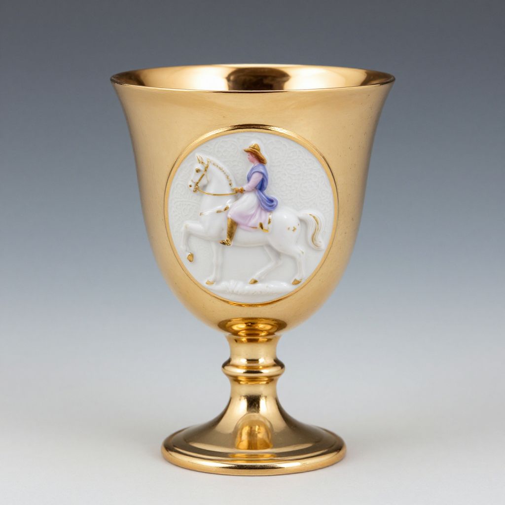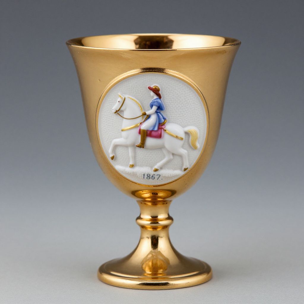 Elegant Aynsley Commemorative Loving Cup featuring a gold rim, base, and stem, adorned with a detailed porcelain medallion depicting a woman riding a horse, set against a textured background with the inscription \"1867.\