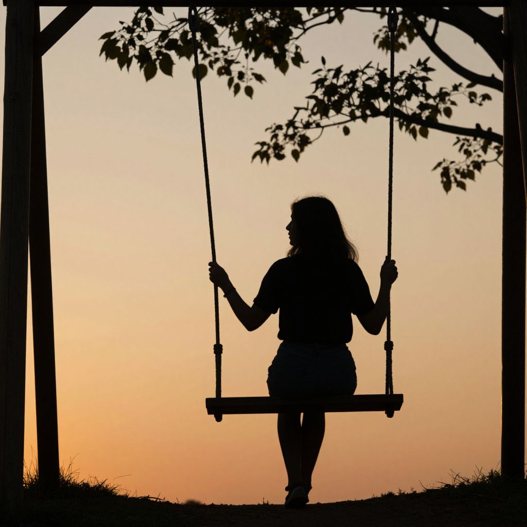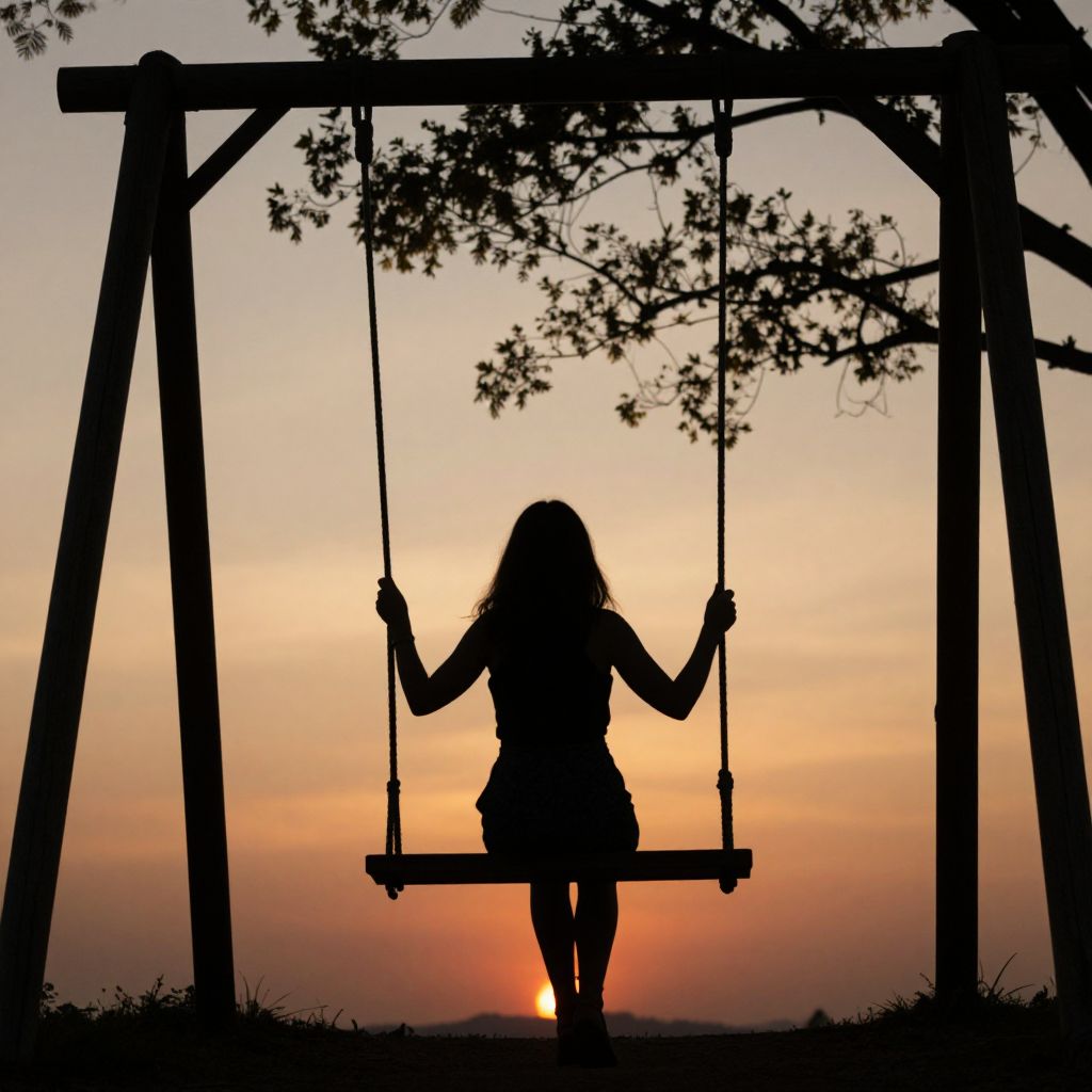 Silhouette of a solitary woman sitting on a wooden swing, framed by a sunset backdrop and leafy branches above, evoking a serene yet contemplative mood.