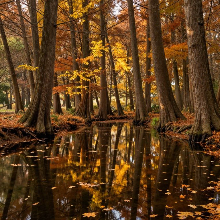 Photograph of a serene autumn forest scene featuring tall trees with rough, brown bark standing in a calm, reflective pond. The trees are adorned with vibrant orange and yellow leaves, contrasting with the darker brown and green foliage. Fallen leaves float on the still water, creating a mirror-like reflection of the colorful trees. The forest floor is covered with a layer of brown leaves, enhancing the autumnal atmosphere. Sunlight filters through the leaves, casting warm, golden light across the scene. The image captures the peaceful beauty and rich colors of a fall forest.