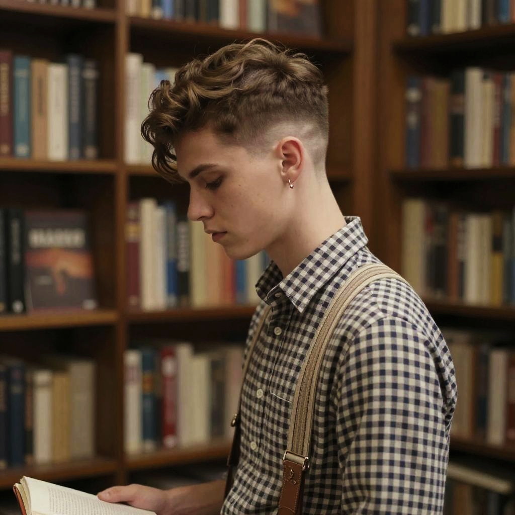 Side Part Undercut hairstyle on hipster male, wearing checked shirt and suspenders, in vintage bookstore, captured in fashion editorial style with low key moody light.