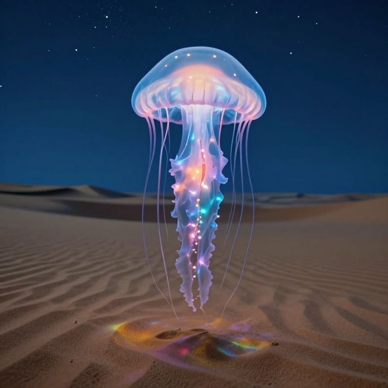 A colossal jellyfish hovers silently above a desert wasteland, its bioluminescent veins pacing the stars and casting kaleidoscopic ripples on the sand below.
