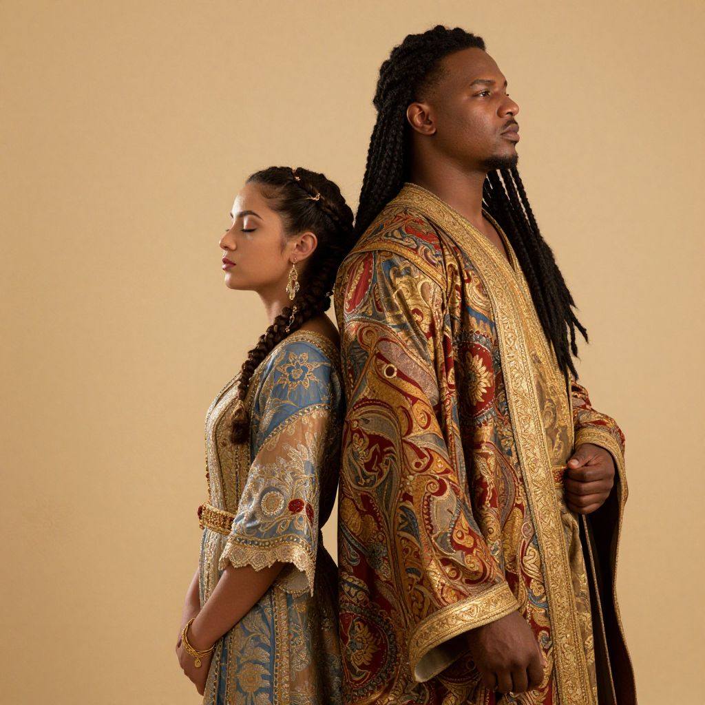 Photograph of a Black couple standing back-to-back against a solid beige background. The woman, with braided hair, wears a gold and blue patterned dress with intricate embroidery. The man, with long dreadlocks, wears a richly textured, gold and red patterned robe with ornate designs. Both have serious expressions, and the woman gazes downward while the man looks to the right. The lighting is even, highlighting the detailed textures of their clothing. The image has a warm, golden hue, enhancing the opulent feel of their traditional attire.