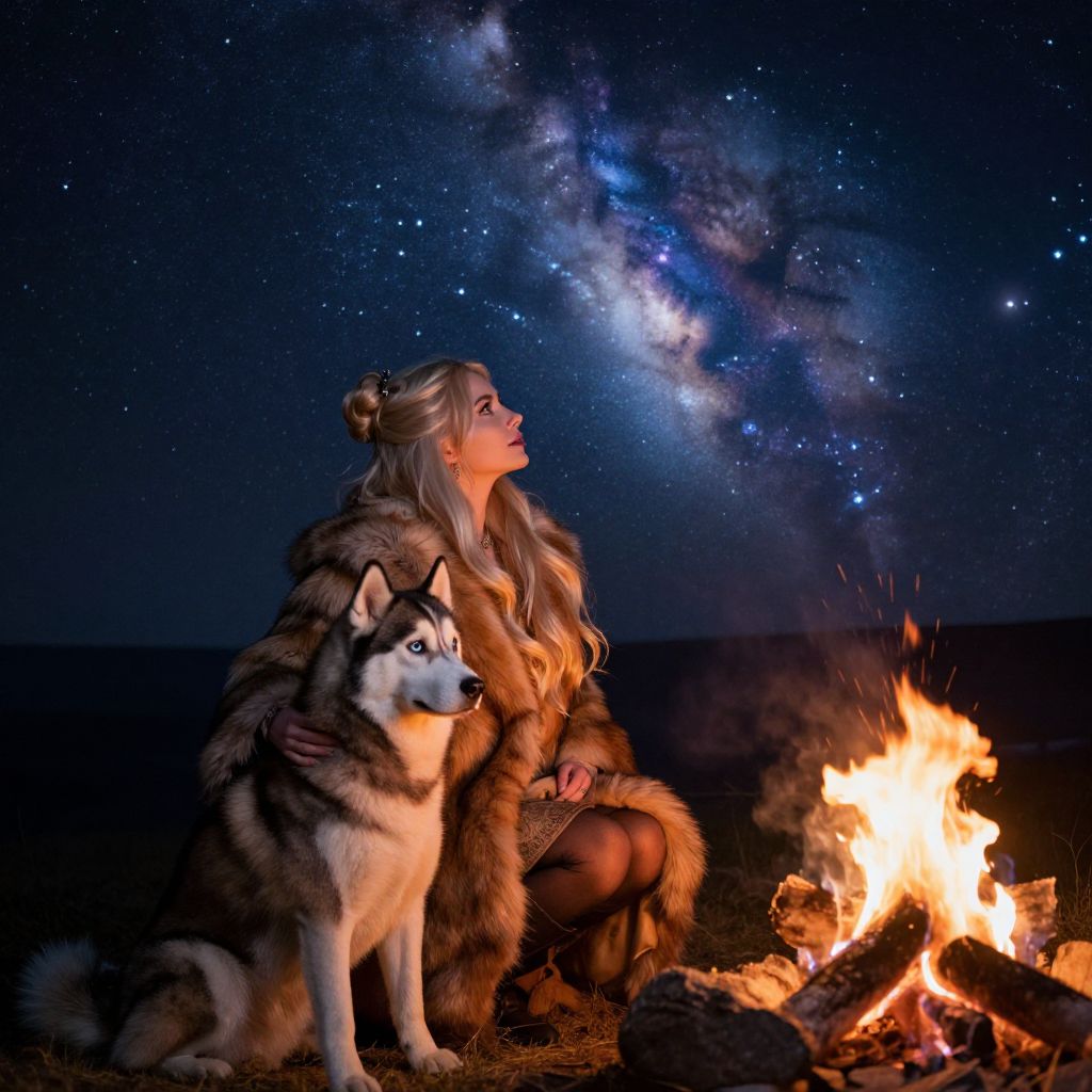 Siberians resting around a campfire in the heart of a frozen forest, their warm, expressive faces illuminated by the firelight, surrounded by ancient trees and shimmering ice crystals in a quiet, serene winter night.