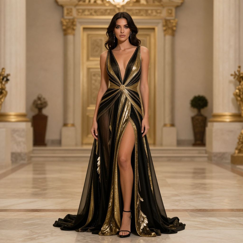 Black and gold goddess dress, a woman in a black and gold dress standing in a hall
