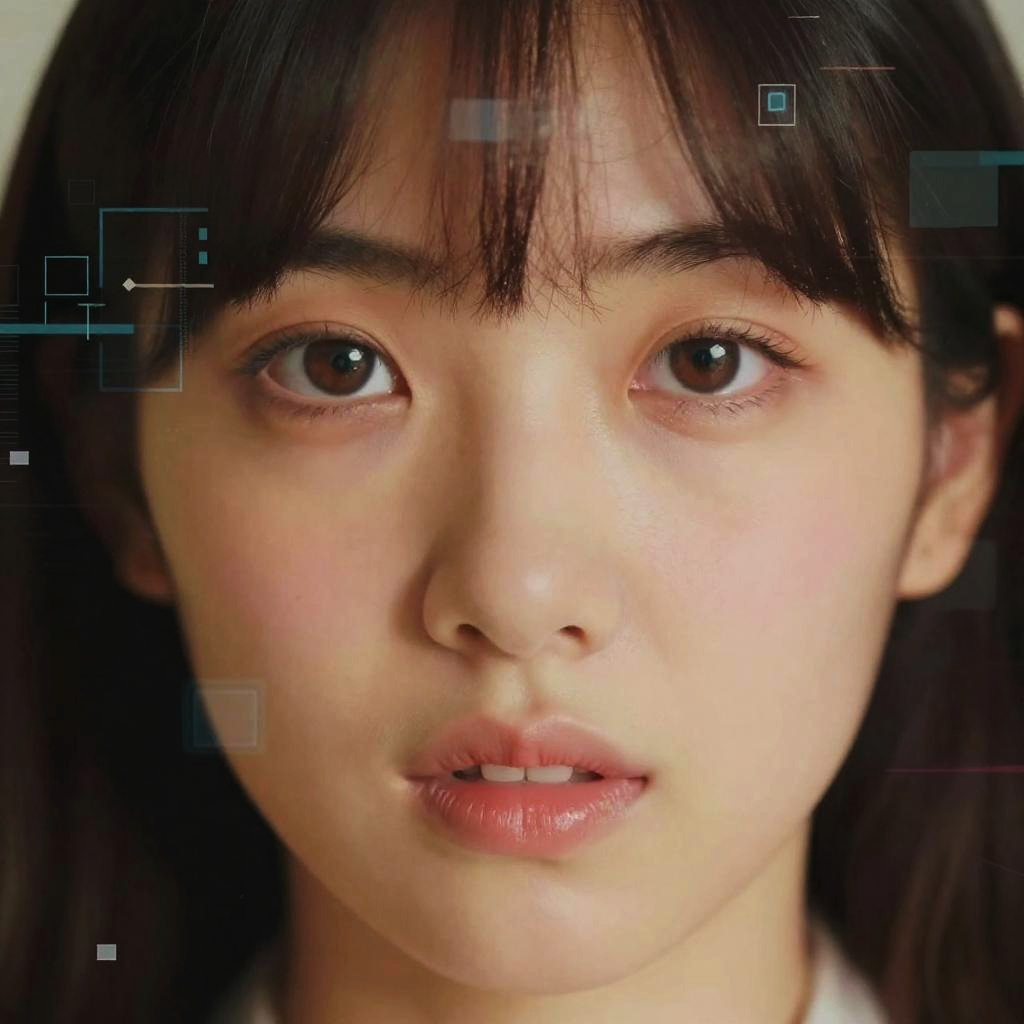 Close-up portrait enhanced with a 70s AI filter, saturated warm tones, slight blur, and color distortions reminiscent of old VHS tapes, overlaid with geometric digital patterns and soft glitch effects creating a fusion of retro aesthetics and futuristic AI enhancements.