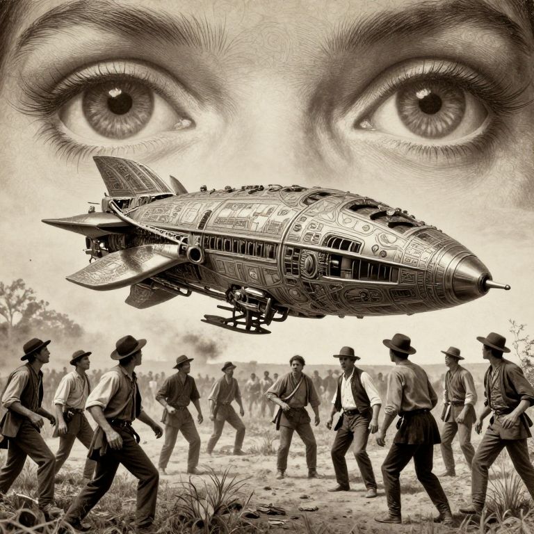 This digital artwork in a monochromatic sepia tone features a detailed, vintage-style jet aircraft with intricate patterns and text on its surface, flying above a group of eight men in 1940s-style attire, including hats and dress shirts. The men, with varied physiques and skin tones, walk in a grassy field. Dominating the upper part of the image are large, realistic, hyper-focused eyes with detailed pupils and expressive eyebrows, creating a surreal, intense effect. The background is subtly blurred, emphasizing the jet and the men. The overall style merges realism with surrealism, blending historical elements with fantastical imagery.