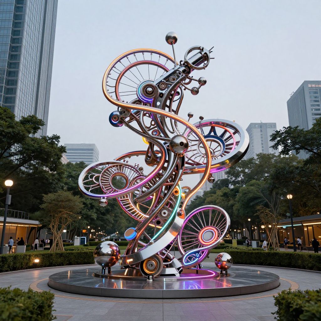 Kinetische sculpture set in a futuristic city park, intricate metallic components revolving gracefully under soft neon lights, dynamic movement captured in a hyperrealistic style, blending technology with organic forms, vibrant yet elegant color palette.