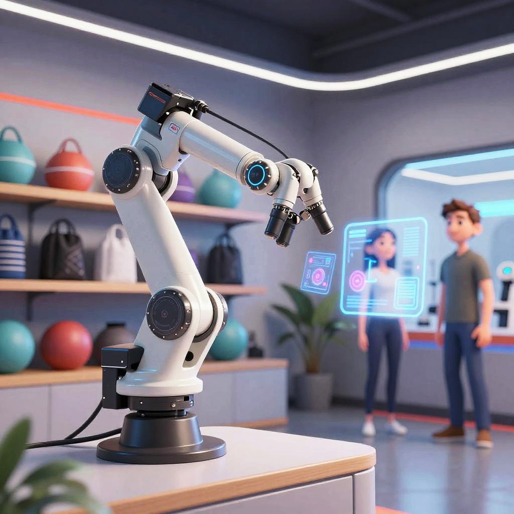 Realistic photo.Robot arm in a high-tech sports equipment shop of the year 3000, grabbing advanced fitness gear off the shelf. Friendly, Pixar-style design, depicting AI and holograms with humans and robots interacting happily. 8K octane render, future retail aesthetic realistic photo