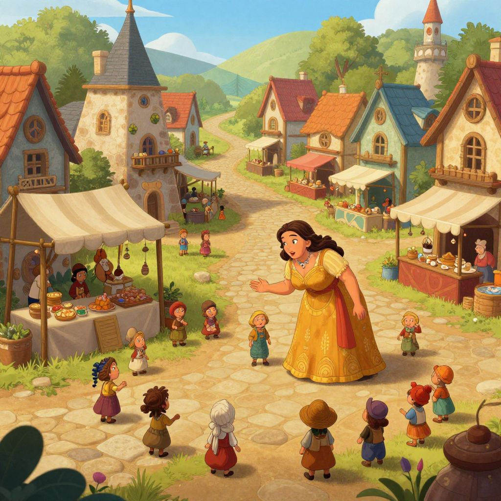Giantess interacting gently with tiny human villagers in a vibrant medieval village square, colorful market stalls and cobblestone streets, warm afternoon lighting, whimsical fantasy setting, expressive character design with detailed environment textures.