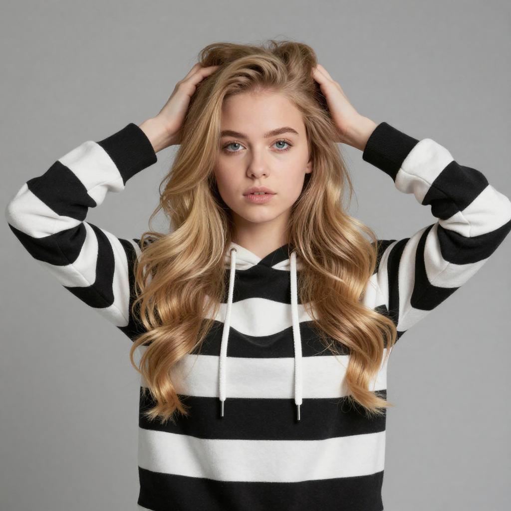 Photograph of a young woman with long, blonde hair, wearing a colorful, striped hoodie with blue, white, black, red, and brown panels. She is adjusting her hood with both hands, looking slightly to the side with a neutral expression. The background is a plain, light gray.