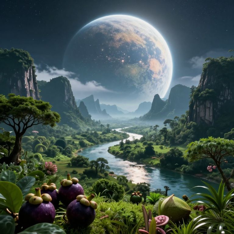 The image presents a breathtaking, otherworldly landscape that seamlessly blends elements of fantasy and cyberpunk aesthetics. Dominating the scene is a massive, glowing planet that casts a ethereal light over the entire landscape, creating a dramatic and surreal atmosphere. The planet's surface is dotted with small, bright spots, adding to the otherworldly feel. In the foreground, lush greenery thrives, with vibrant shades of green and hints of purple and pink, reminiscent of mangosteen and greent coconut. The vegetation is dense and varied, with tall, leafy trees and sprawling bushes that create a rich tapestry of textures. A winding river cuts through the valley, its waters reflecting the light from the planet and the distant stars. The landscape is punctuated by towering, jagged mountains that rise in the background, their peaks shrouded in mist. The overall composition is balanced, with the planet and the river serving as focal points that draw the viewer's eye through the scene. The image is high resolution and cinematic, with a sense of depth and scale that enhances the otherworldly quality of the landscape.