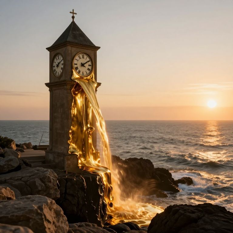 Time cascades like molten gold from a clock tower, its radiant flow illuminating the rocky shore and casting an ethereal glow upon the sea, evoking a profound sense of transience and the bittersweet allure of memories shaped by its liquid embrace.