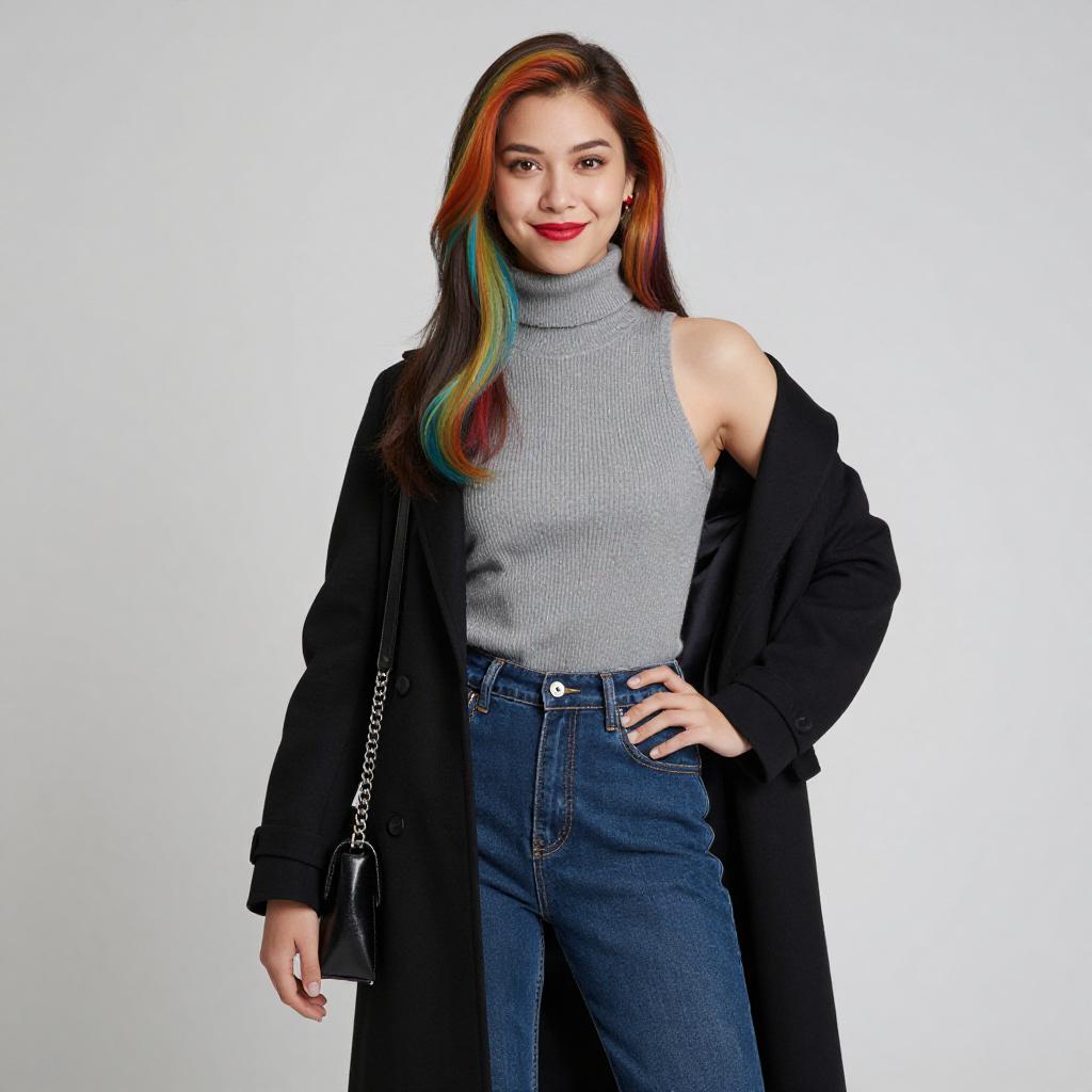 Photograph of a confident woman with long, multi-colored hair, wearing a gray turtleneck, black coat, and high-waisted blue jeans