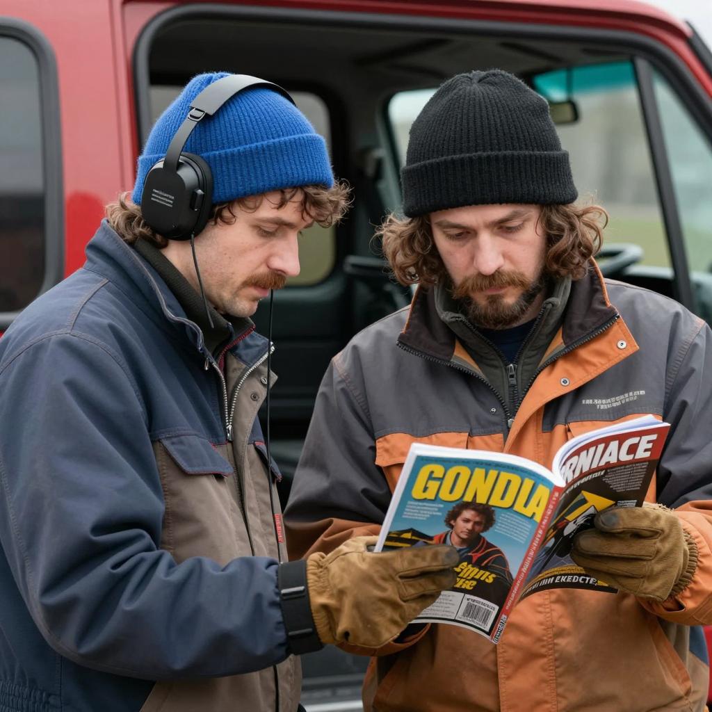 Two men standing outdoors in a commercial area. Left man with curly hair, beard, red headband, glasses, brown fur vest with patches, gray shirt, and jeans. Right man with curly hair, mustache, black beanie, blue patterned shirt. White truck and red building in background. Both looking to the left.