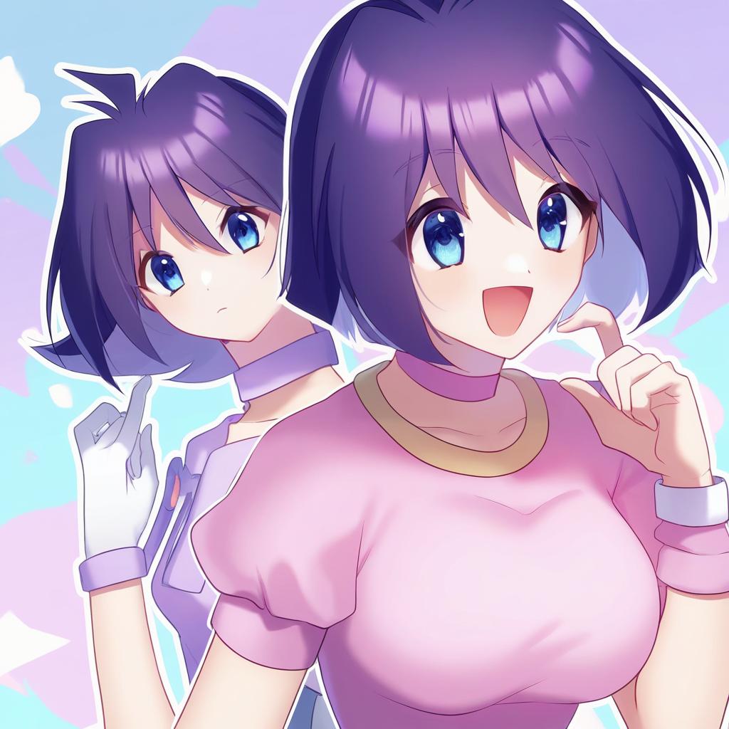 Digital anime-style illustration featuring two young female characters with short purple hair and blue eyes. One character wears a pink top with a gold neckline and a pink choker, smiling brightly. The other character, standing in the background, has a more serious expression and wears a white outfit with gloves and a purple choker. The background is a soft pastel gradient with light blue and purple hues.