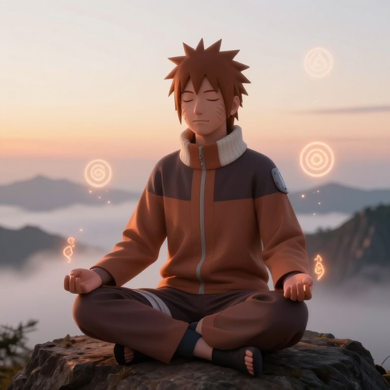 Naruto brown hair, serene scene of a brown-haired ninja meditating on a mountain peak at dawn, eyes closed in concentration, glowing chakra symbols floating around, detailed textures in clothing and environment, ethereal light effects and mist