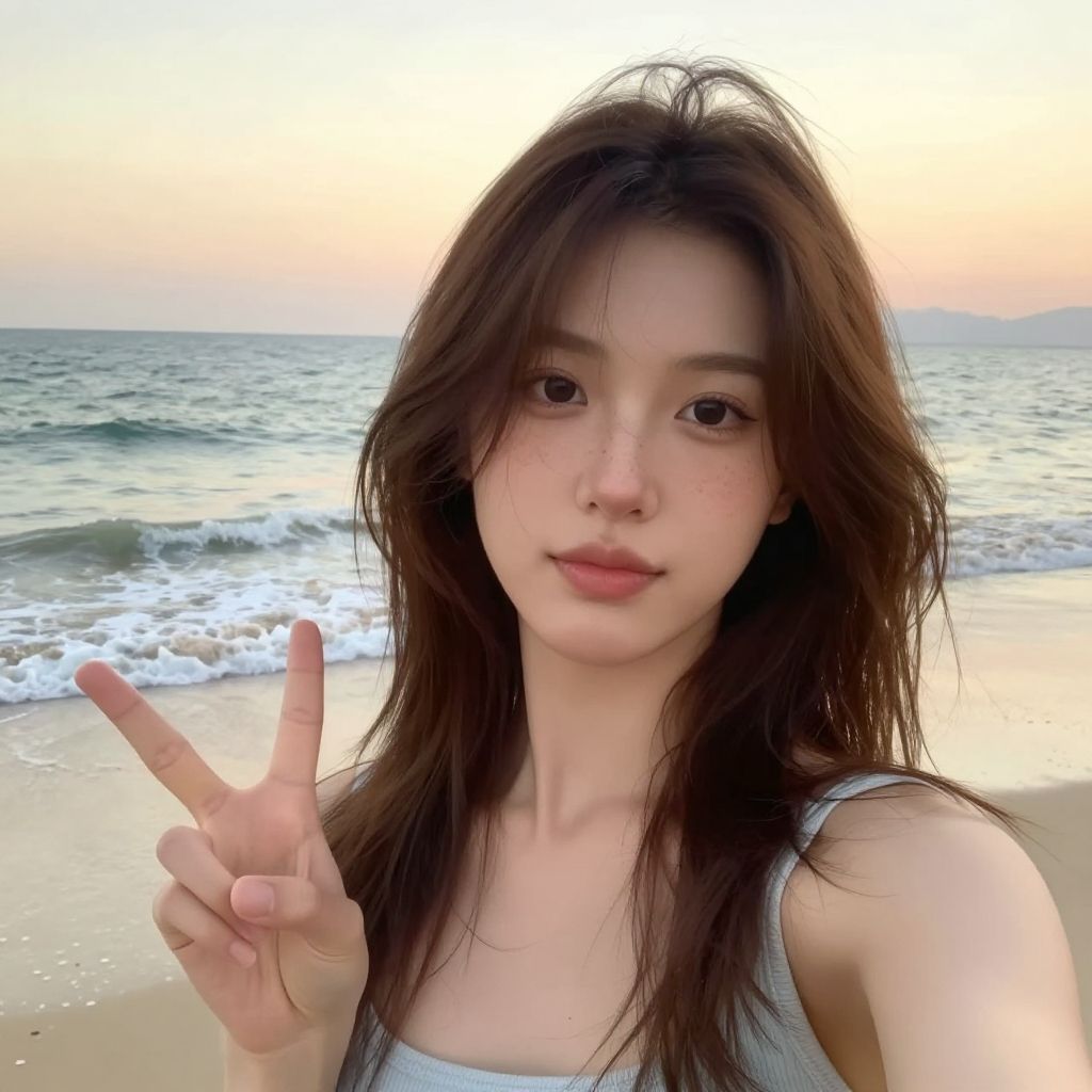 Brown hair girl peace sign selfie, flower field in springtime, soft natural sunlight, gentle breeze, wearing a flowing sundress, cheerful mood, vibrant nature colors