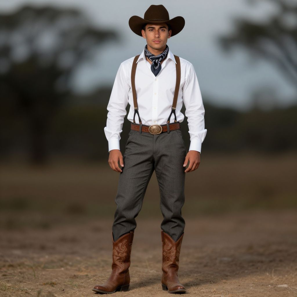 Photograph of a young man standing outdoors on a dirt path. He has a medium build, olive skin, and dark hair peeking from under a black cowboy hat. He wears a white long-sleeve shirt, dark gray pants with brown suspenders, a black and white bandana, and brown cowboy boots. A large silver belt buckle is visible. The background is blurred, featuring dark green trees and a blue sky. The overall style is classic cowboy attire, with a focus on traditional Western fashion. The lighting is natural, highlighting the subject against the soft, out-of-focus background.