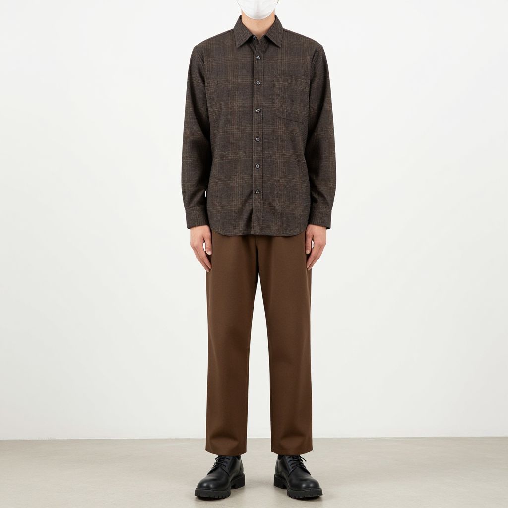 Man wearing a plaid shirt, brown pants, and black shoes with a mask on his face.