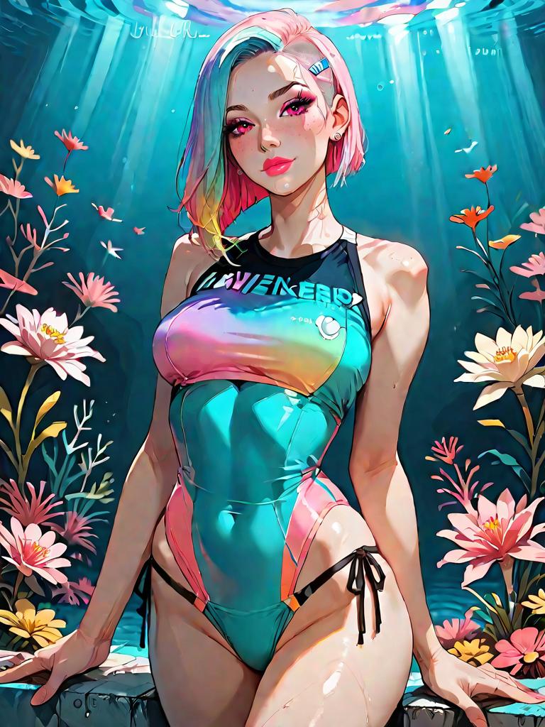 Digital art of a fantasy anime-style girl with long white hair and blue eyes, wearing a shiny teal monokini with a deep V-neckline and gold chain details. She has golden antler headpieces and matching gold earrings, set against an underwater background with vibrant coral formations.