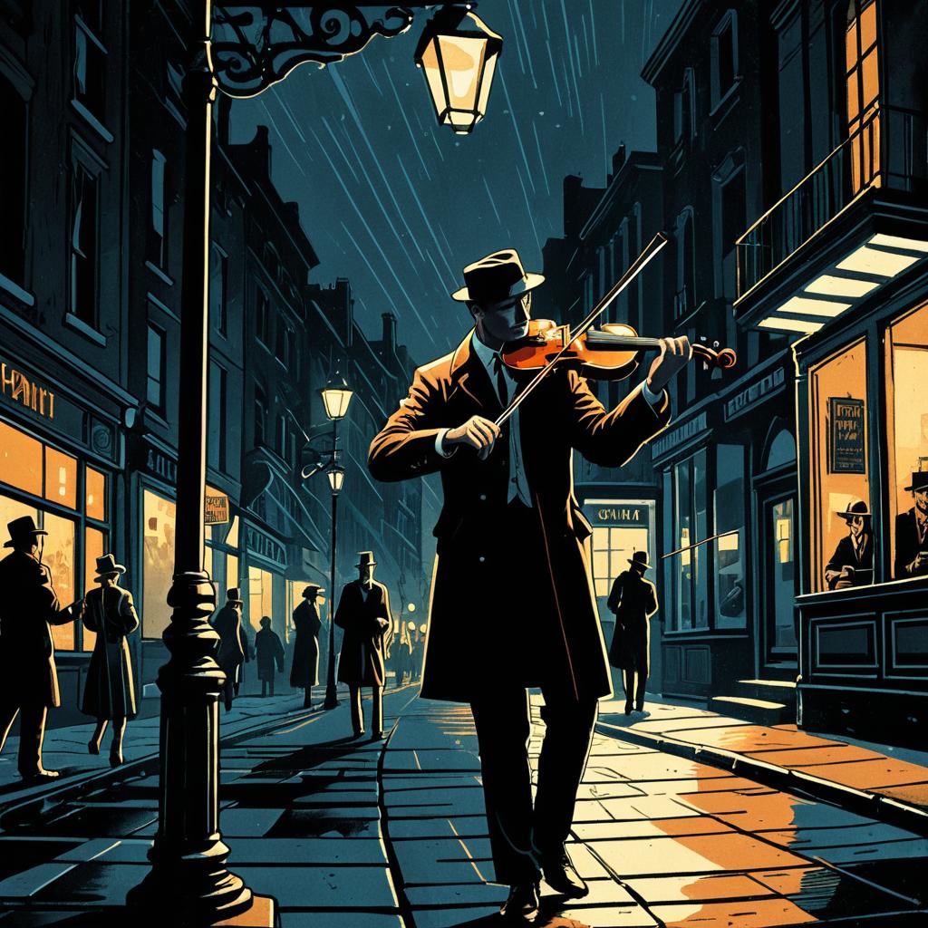Illustration of a violinist playing under a street lamp on a city street at night, depicted in a film noir style with warm tones and detailed, expressive comic panel aesthetics. The scene features multiple figures in vintage attire including coats and hats, with dramatic lighting and shadow effects enhancing the romanticized, cinematic atmosphere.