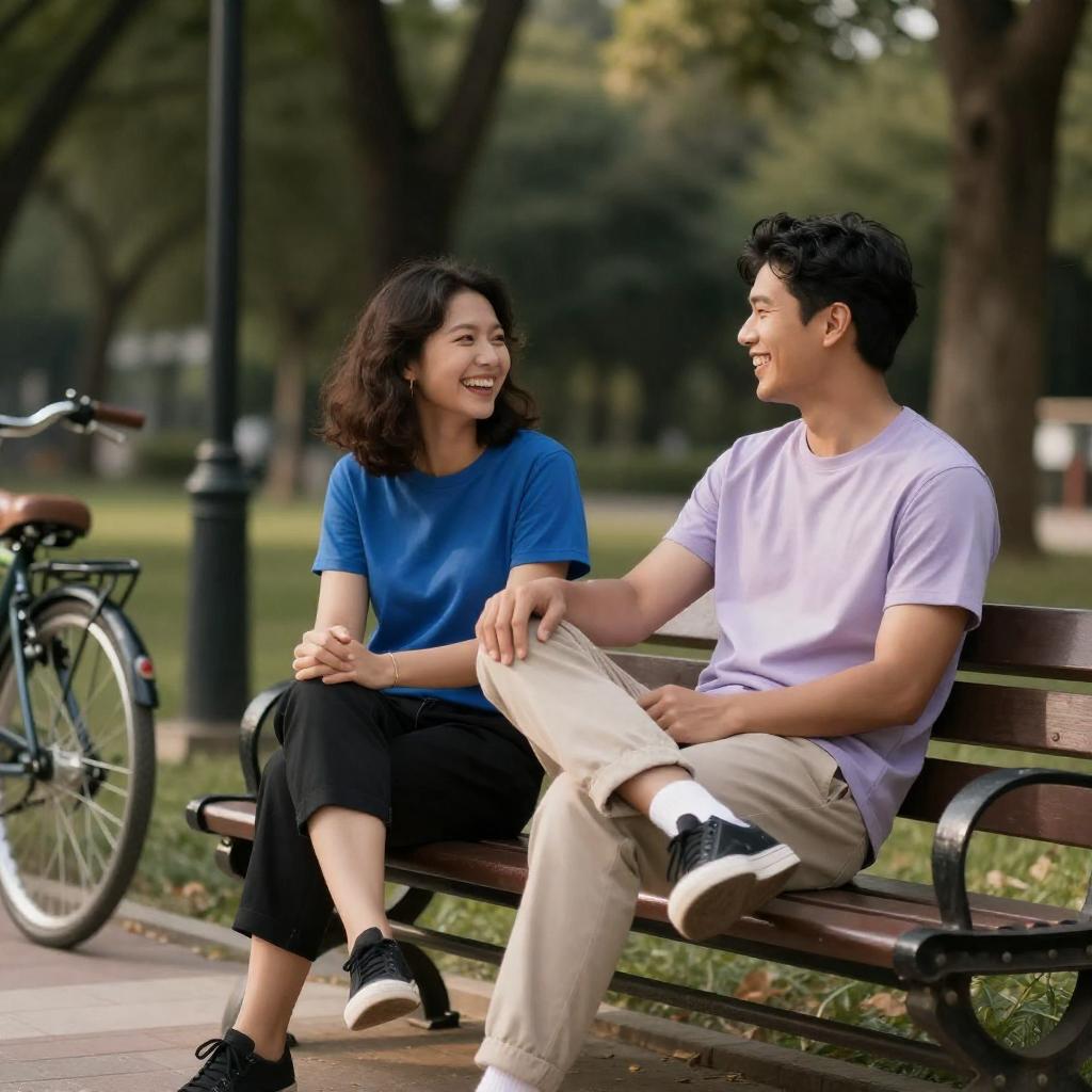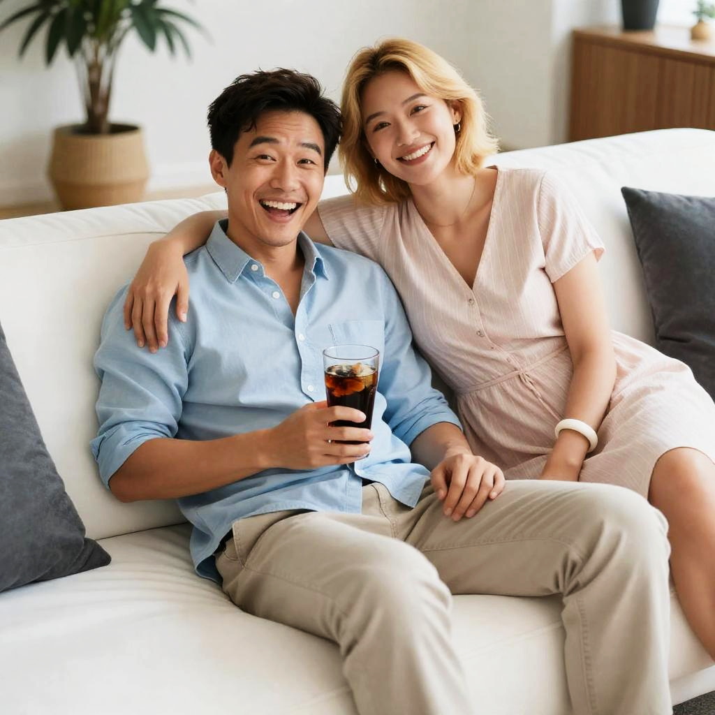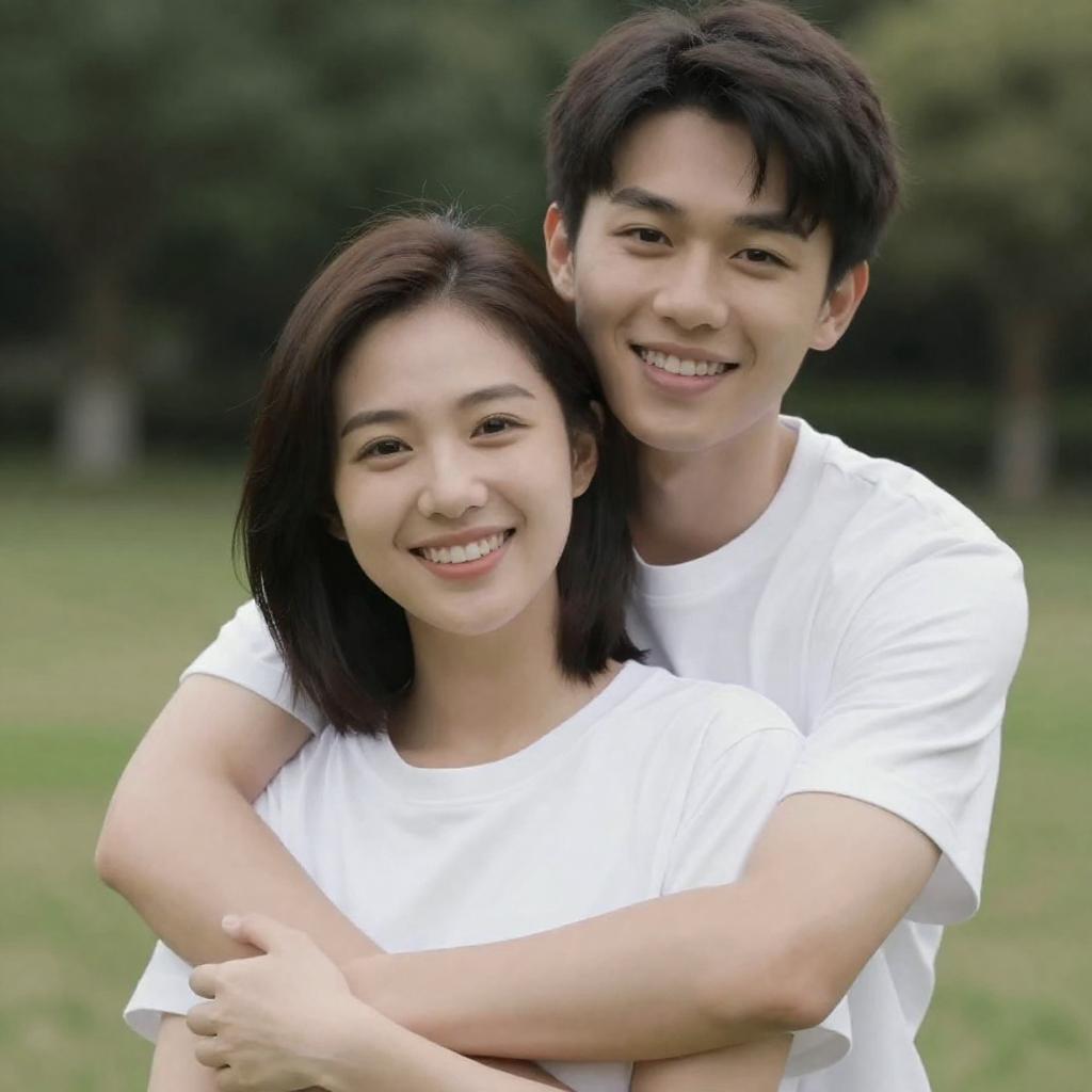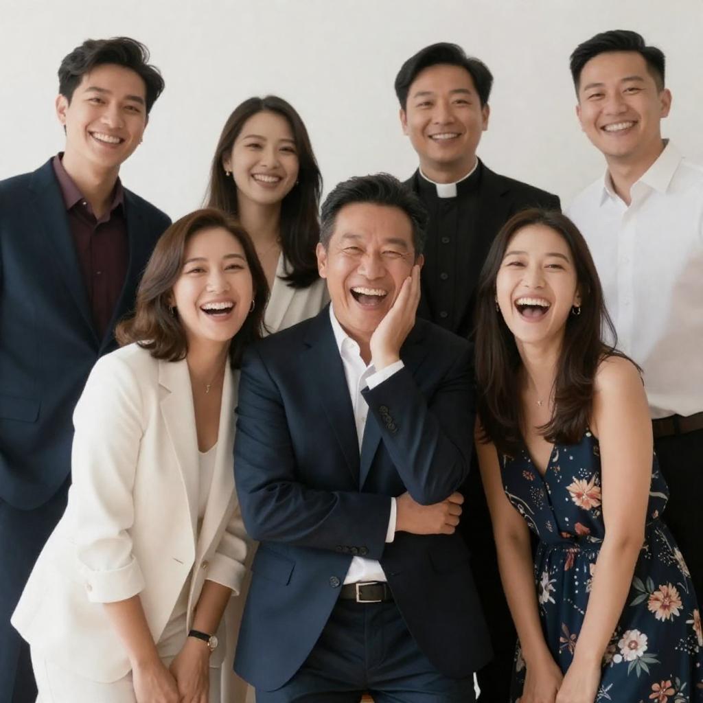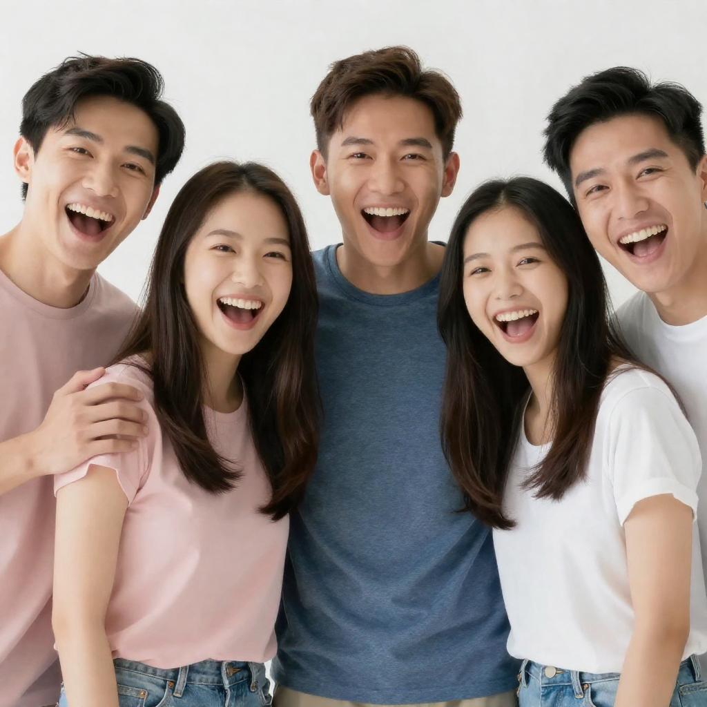 Photograph of four smiling Asian people standing close together. Three men and one woman, all with long hair. Man in center wears blue shirt, others wear pink and white tops. Bright outdoor setting. Three men have arms around woman. All have open mouths, visible teeth, joyful expressions. Casual clothing.