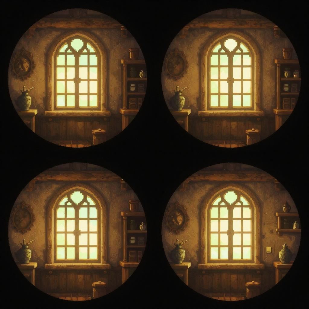 This image is a digital collage featuring four close-up, circular views of a dimly lit, medieval-style room. Each circular view showcases a large, glowing window with an ornate frame, surrounded by rustic wooden walls and shelves holding various objects. The colors are warm and earthy, with shades of brown, gold, and green, giving the room a cozy, old-world feel. The overall style is pixelated and slightly gritty.