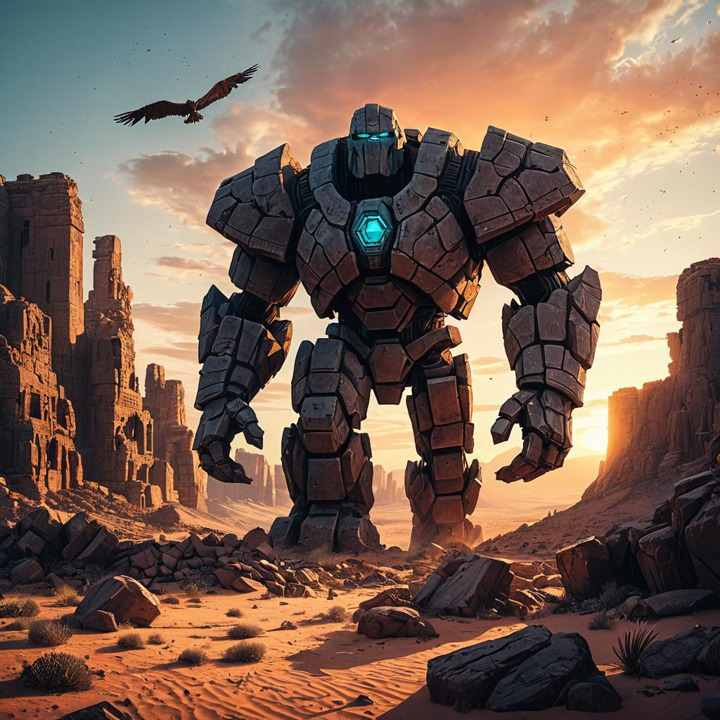 Ultra-photorealistic digital painting of a massive ancient stone golem standing amidst crumbling desert ruins at sunset. The golem, constructed of large rock slabs, dominates the arid landscape filled with scattered stones and sparse vegetation. The scene features vibrant colors with cinematic global illumination, highlighting the detailed textures and dramatic lighting of the sunset desert environment.