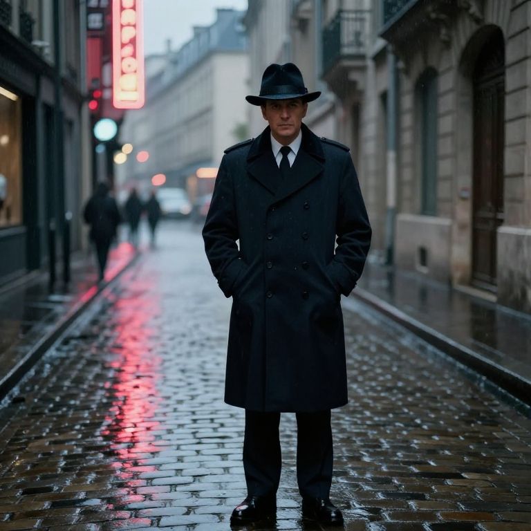 Photograph of a pensive man in a dark hat and coat, smoking a cigarette on a rainy evening street, with a brightly lit, ornate